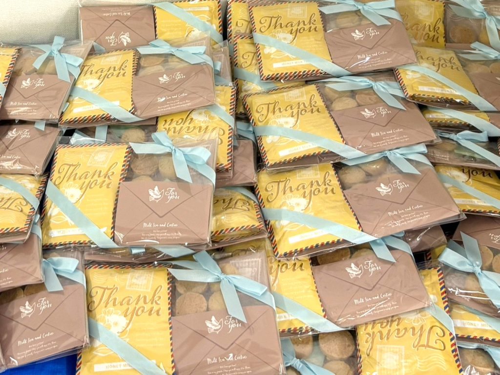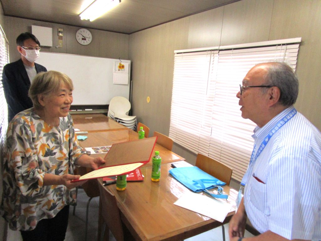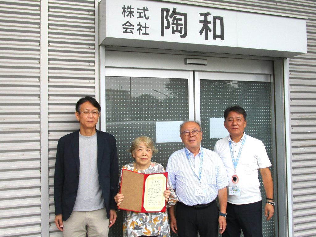 (株)陶和様より、粉末スープとクッキーのプチギフトセットを890食、4種類の粉末スープを3000食いただきました。そこで、令和7年8月に感謝状の贈呈をさせていただきました。