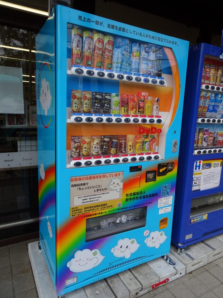 ミニコープ府中南店(府中市南町2丁目1-6)にフードドライブ回収BOXに続き、店頭に地域貢献型自動販売機を設置頂きました。初の当協議会マスコットキャラクターの「ふわり」のラッピングがされた自動販売機です。こちらで購入された金額の一部は域福祉の推進のために活用させて頂きます。地域・社会貢献活動へのご協力ありがとうございます。