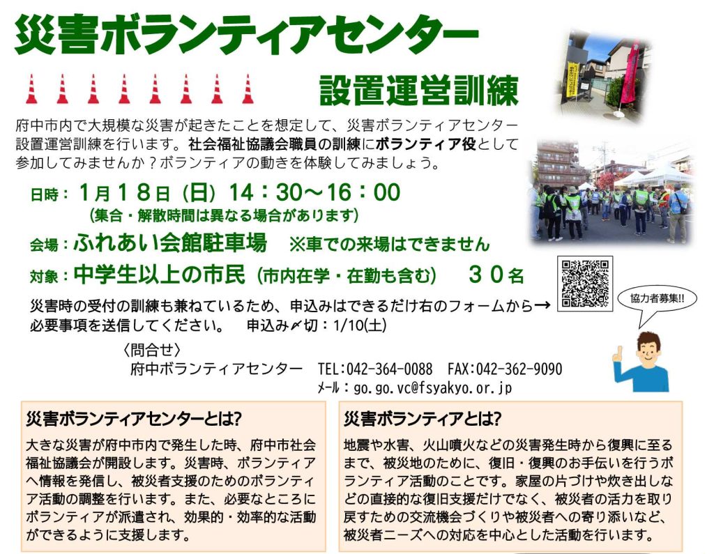 府中市内で大規模な災害が起きたことを想定して、災害ボランティアセンター設置運営訓練を行います。社会福祉協議会職員の訓練にボランティア役として参加してみませんか?ボランティアの動きを体験してみましょう。