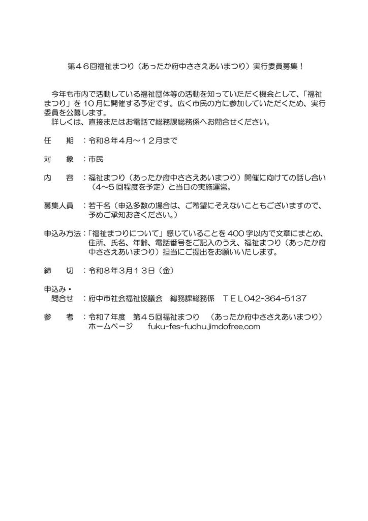 第46回福祉まつり(あったか府中ささえあいまつり)実行委員募集!